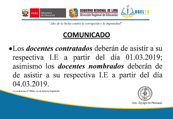 27 Feb,2019 Comunicados COMMENTS Comunicado: Asistencia de Docentes Nombrados y Contratados a sus Respectiva Institución Educativa.