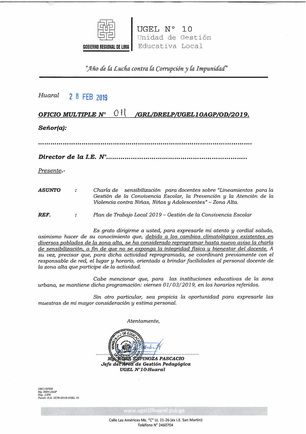 Horarios de atención UGEL N°10: Lunes a Viernes de 08:30 a.m. - 12:30 p.m. y de 14:00 p.m. - 16:30 p.m.