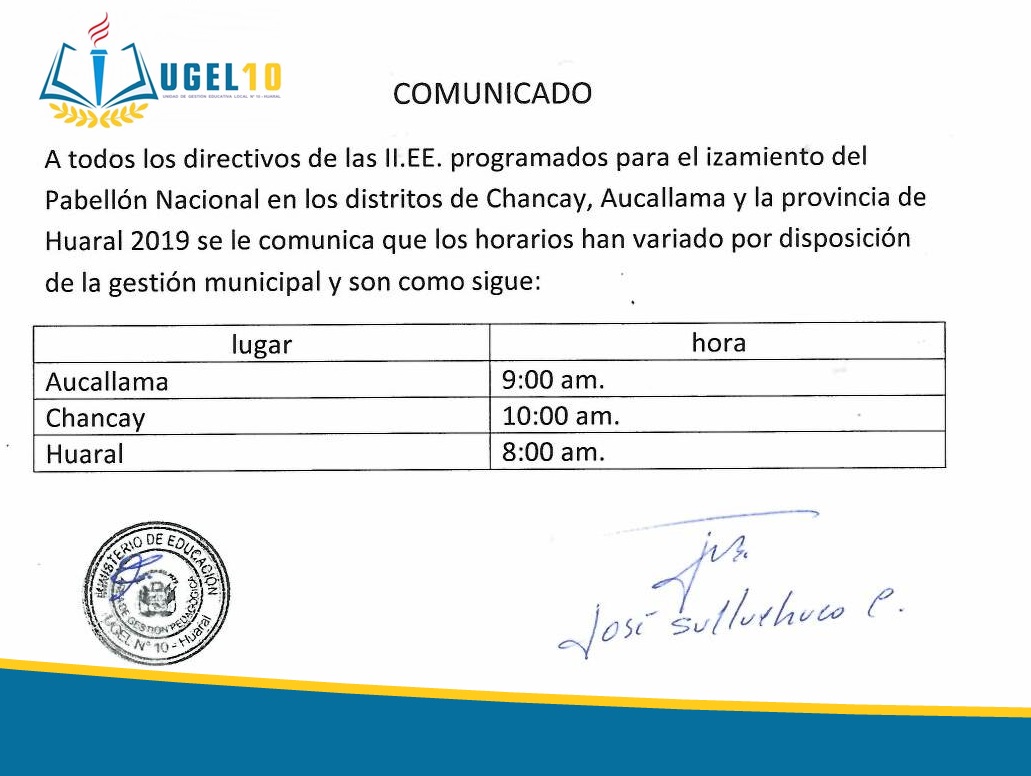 15 Mar,2019 Comunicados COMMENTS Horarios Programados para los Izamientos del Pabellón Nacional por Disposición Municipal. [Huaral-Chancay-Aucallama]