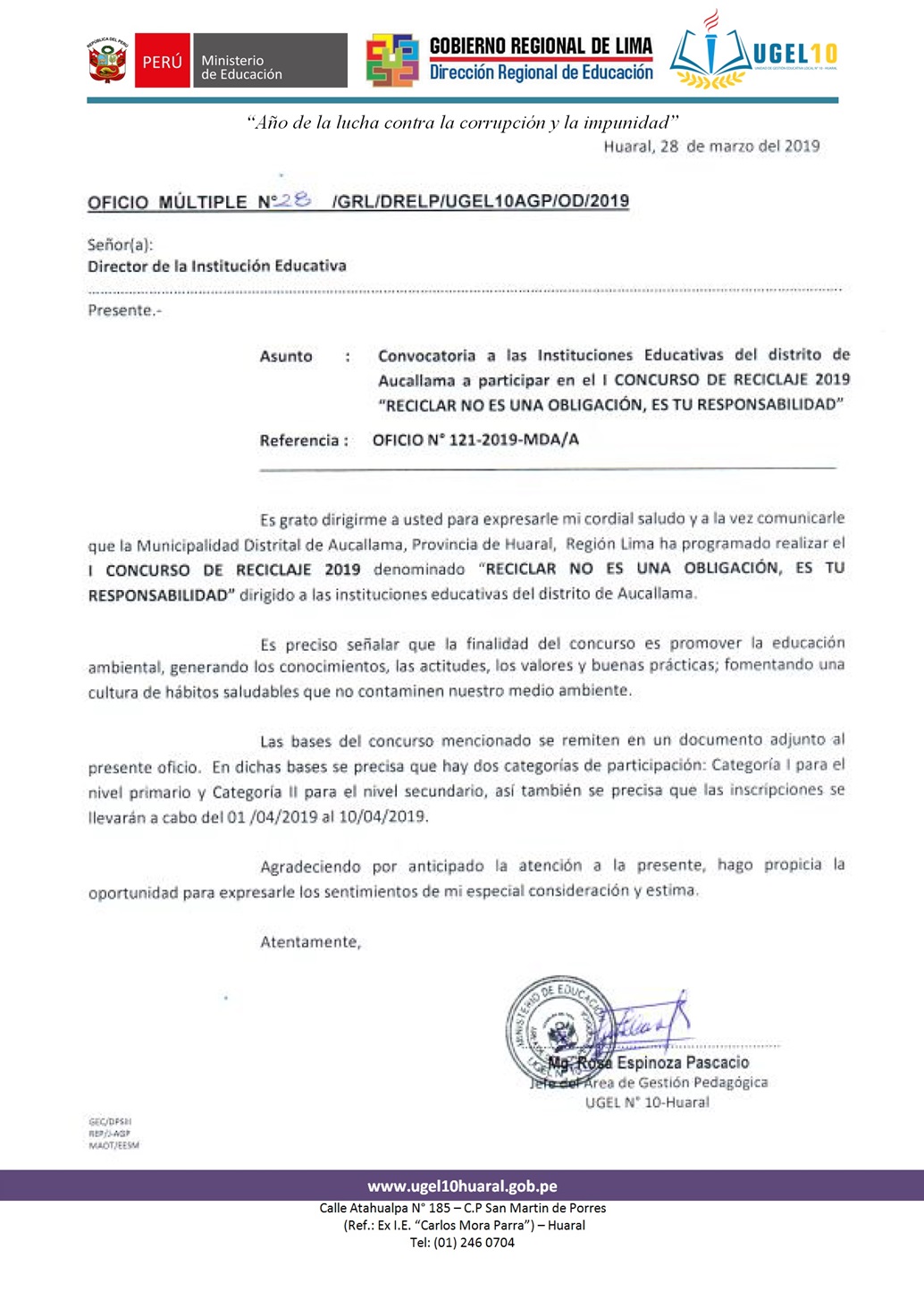 29 Mar,2019 Comunicados COMMENTS Convocatoria a II.EE de Aucallama a Participar en el I Concurso de Reciclaje 2019. ver y descargar Bases del 1er Concurso de Reciclaje Aucallama 2019.