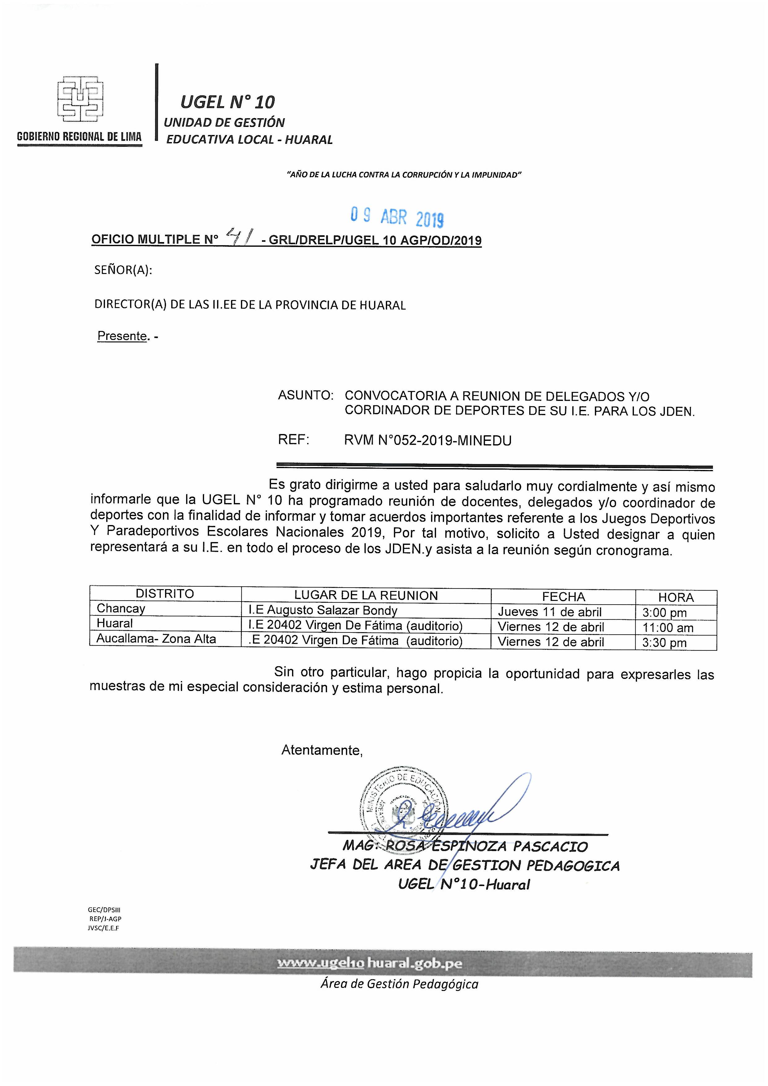 09 Abr,2019 Comunicados COMMENTS CONVOCATORIA A REUNIÓN DE DELEGADOS Y/O COORDINADOR DE DEPORTES DE SU I.E. PARA LOS JDEN.