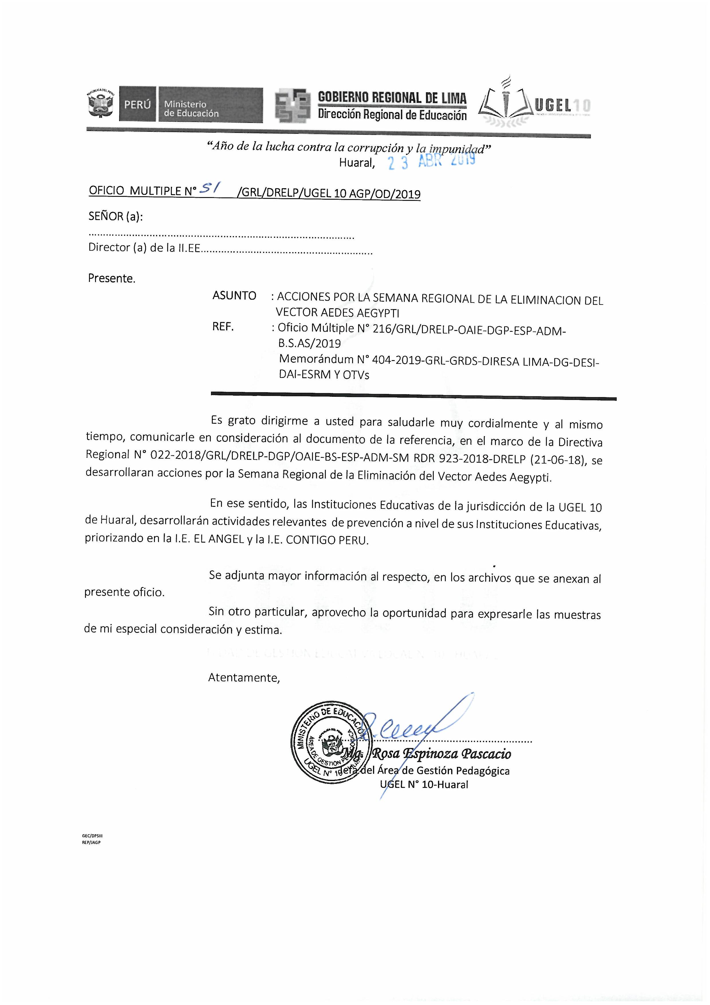 23 Abr,2019 Comunicados COMMENTS ACCIONES POR LA SEMANA REGIONAL DE LA ELIMINACIÓN DEL VECTOR AEDES AEGYPTI ANEXO 1 ANEXO 2 ANEXO 3