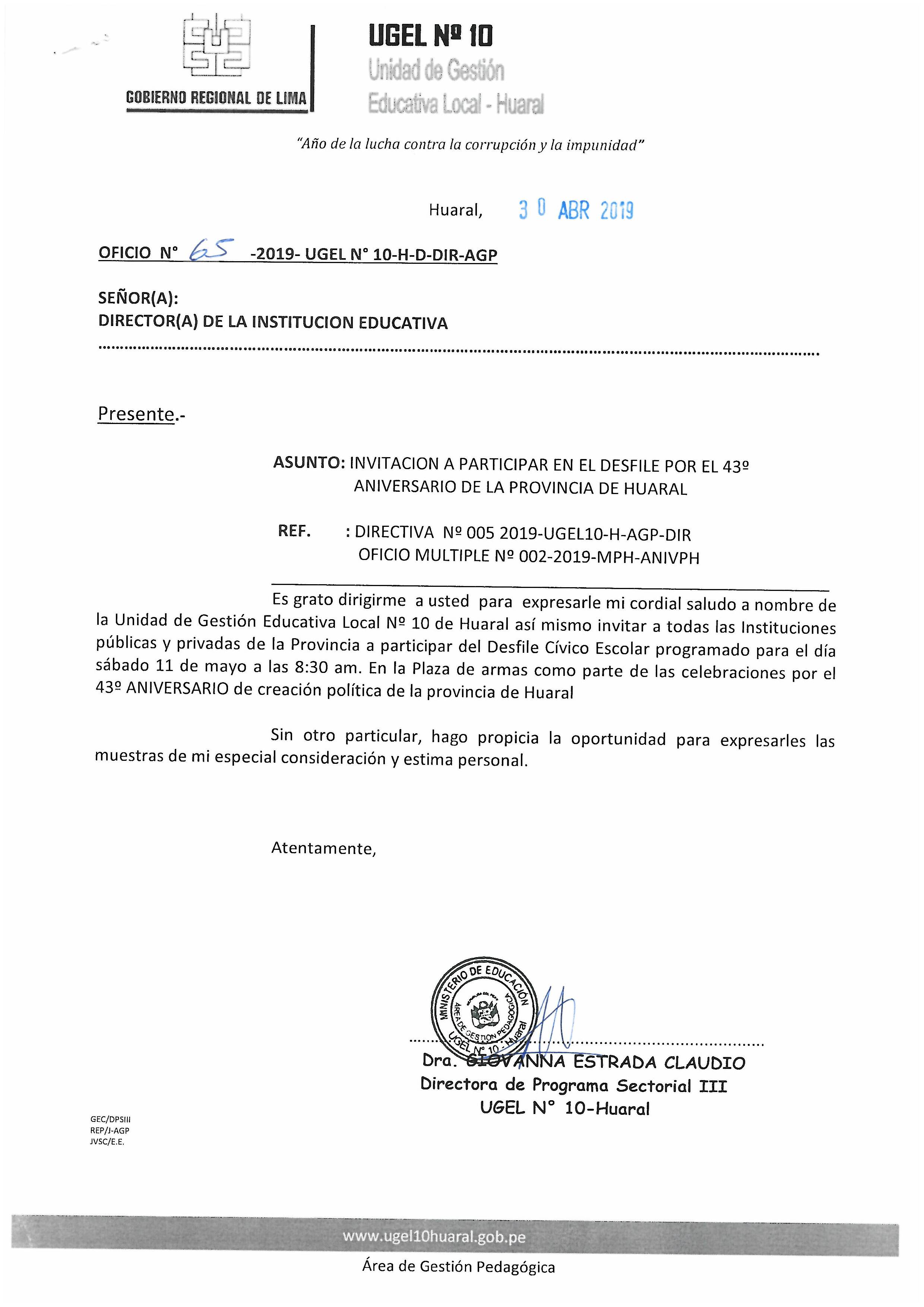 30 Abr,2019 Comunicados COMMENTS INVITACIÓN A PARTICIPAR EN EL DESFILE POR EL 43° ANIVERSARIO DE LA PROVINCIA DE HUARAL VER DIRECTIVA