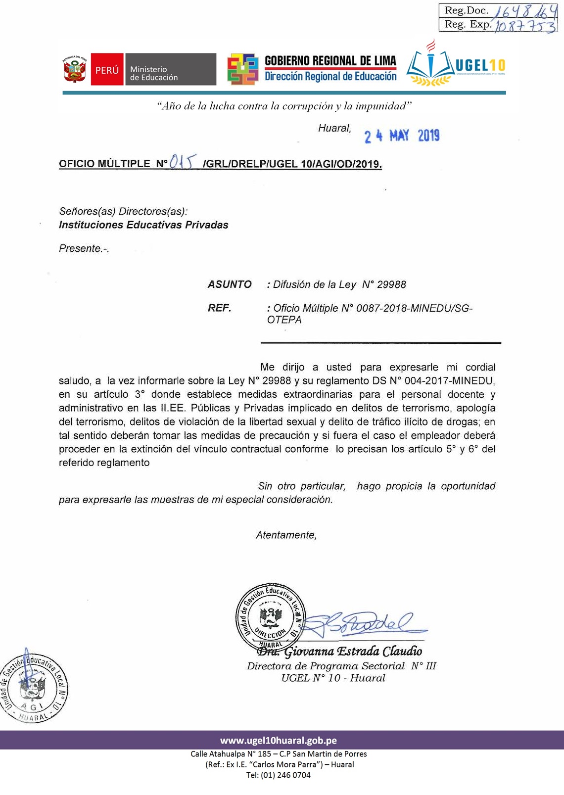 24 May,2019 Comunicados COMMENTS Para II.EE Privadas - Difusión de Ley N° 29988 DESCARGAR (pdf) D.S. N° 004-2017 REGLAMENTO DE LA LEY N° 29988