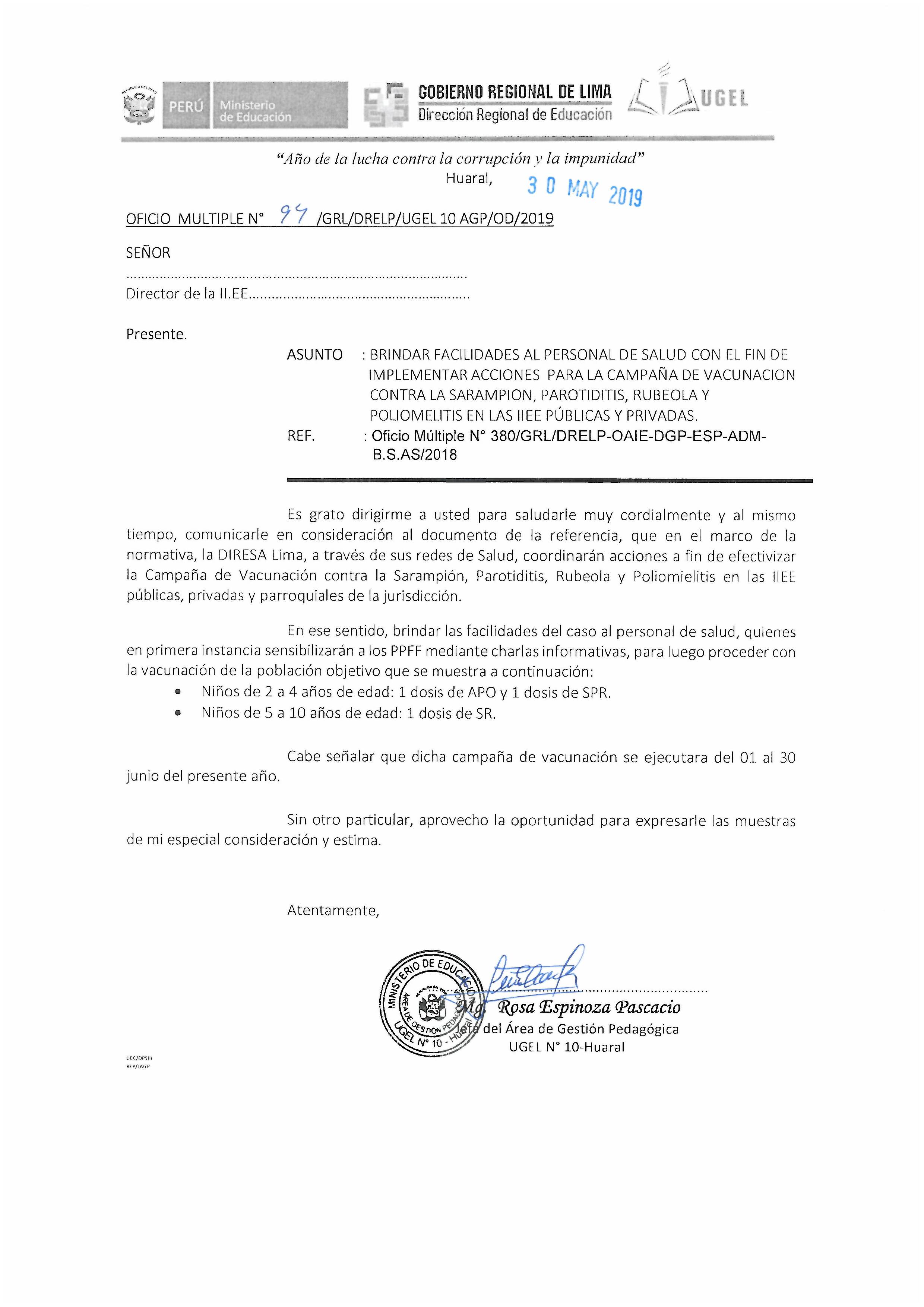 30 May,2019 Comunicados COMMENTS BRINDAR FACILIDADES AL PERSONAL DE SALUD CON EL FIN DE IMPLEMENTAR ACCIONES PARA LA CAMPAÑA DE VACUNACION CONTRA LA SARAMPION, PAROTIDITIS, RUBEOLA Y POLIOMELITIS EN LAS II.EE PÚBLICAS Y PRIVADAS