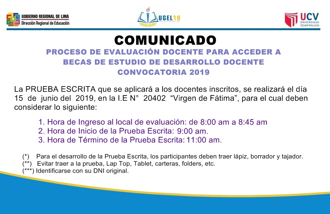 13 Jun,2019 Comunicados COMMENTS Comunicado Proceso de Evaluación Docente para acceder a Becas de Estudio de Desarrollo Docente Convocatoria 2019.