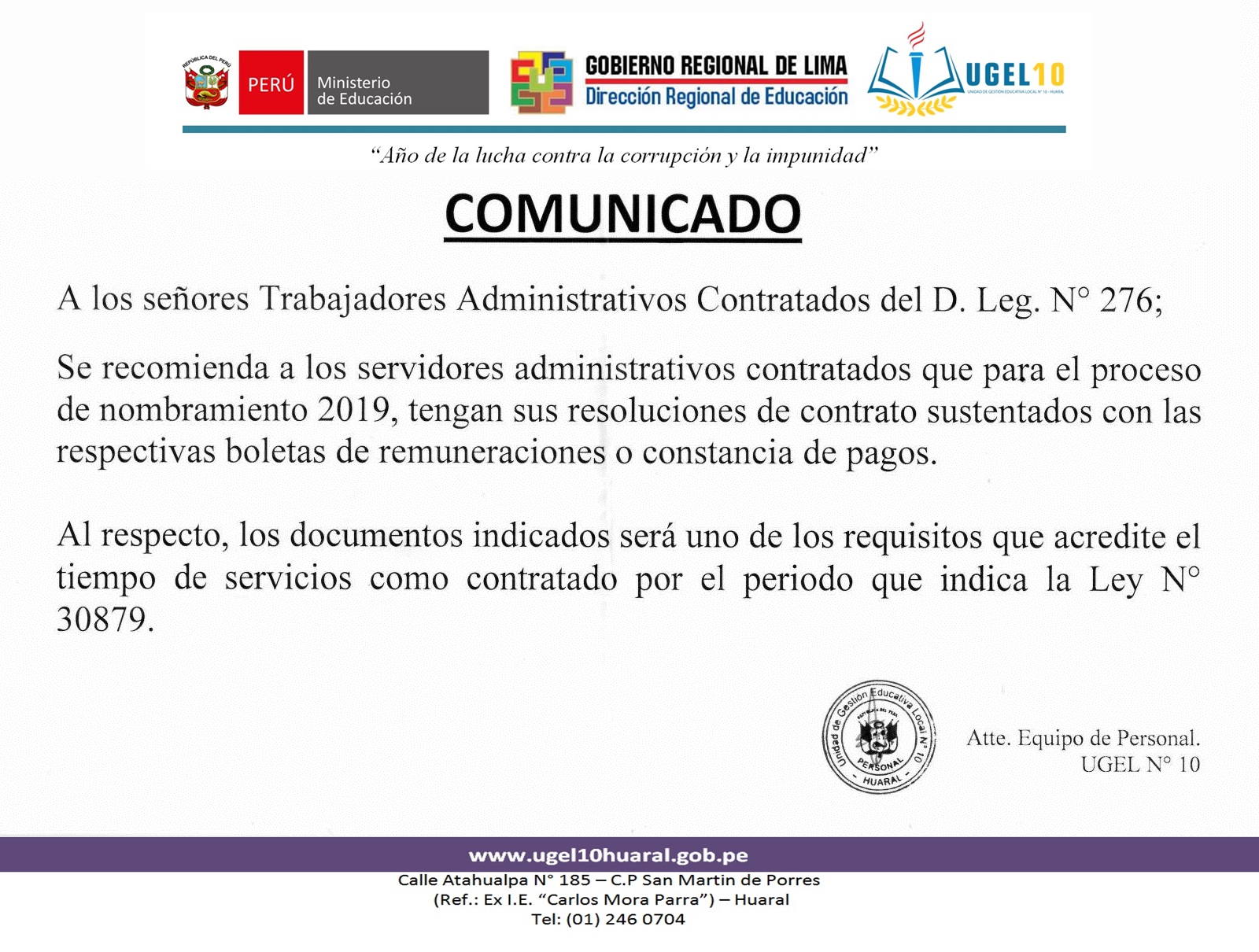 27 Jun,2019 Comunicados COMMENTS Comunicado Trabajadores Administrativos Contratados para el Proceso de Nombramiento 2019.