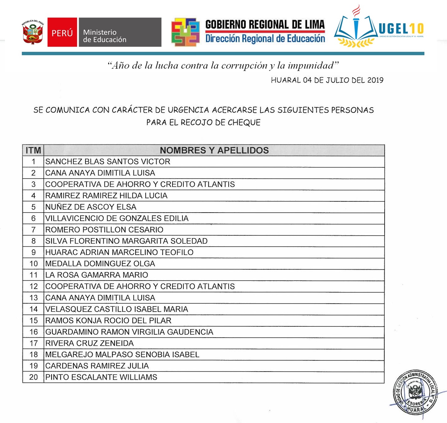 04 Jul,2019 Comunicados COMMENTS Comunicado Oficina de Tesorería - Recojo de Cheque las Siguientes Personas.