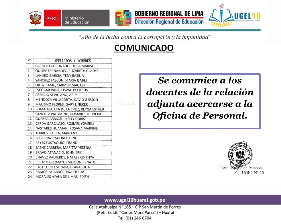 26 Ago,2019 Comunicados COMMENTS Comunicado a los Siguientes Docentes Acercarse a la Oficina de Personal.