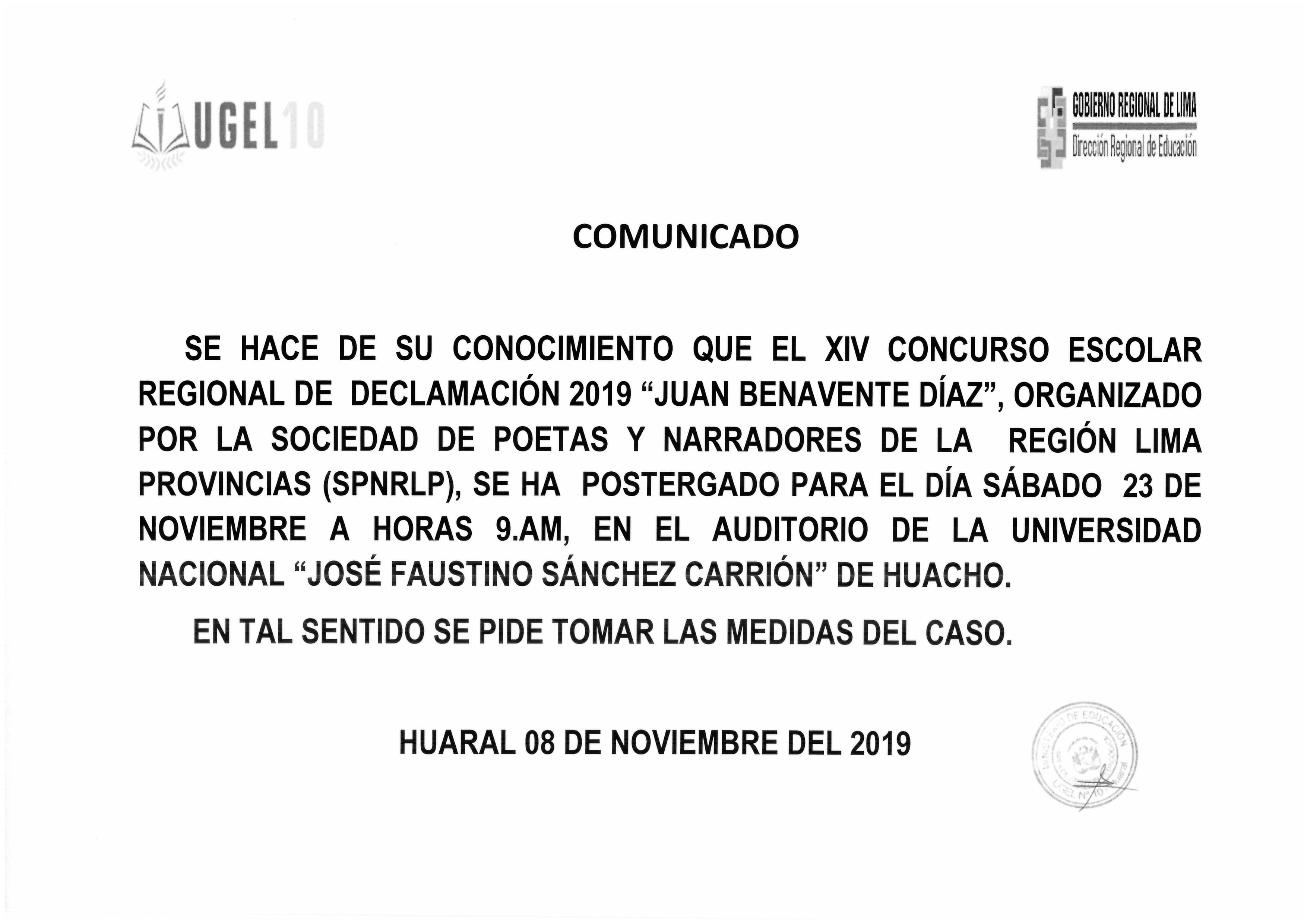 08 Nov,2019 Comunicados COMMENTS XIV CONCURSO ESCOLAR REGIONAL DE DECLAMACIÓN 2019 "JUAN BENAVENTE DÍAZ".