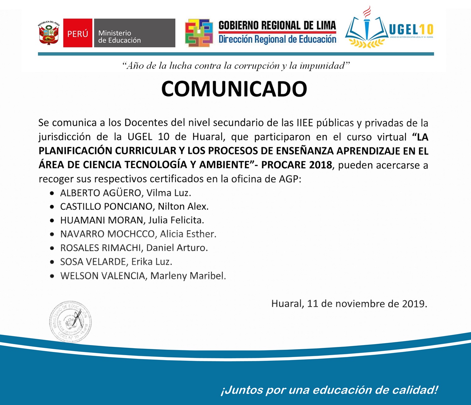 11 Nov,2019 Comunicados COMMENTS Recoger Certificado del Curso Virtual "La Planificación Curricular y los Procesos de Enseñanza Aprendizaje en el Área de Ciencia Tecnología y Ambiente" - PROCARE 2018.