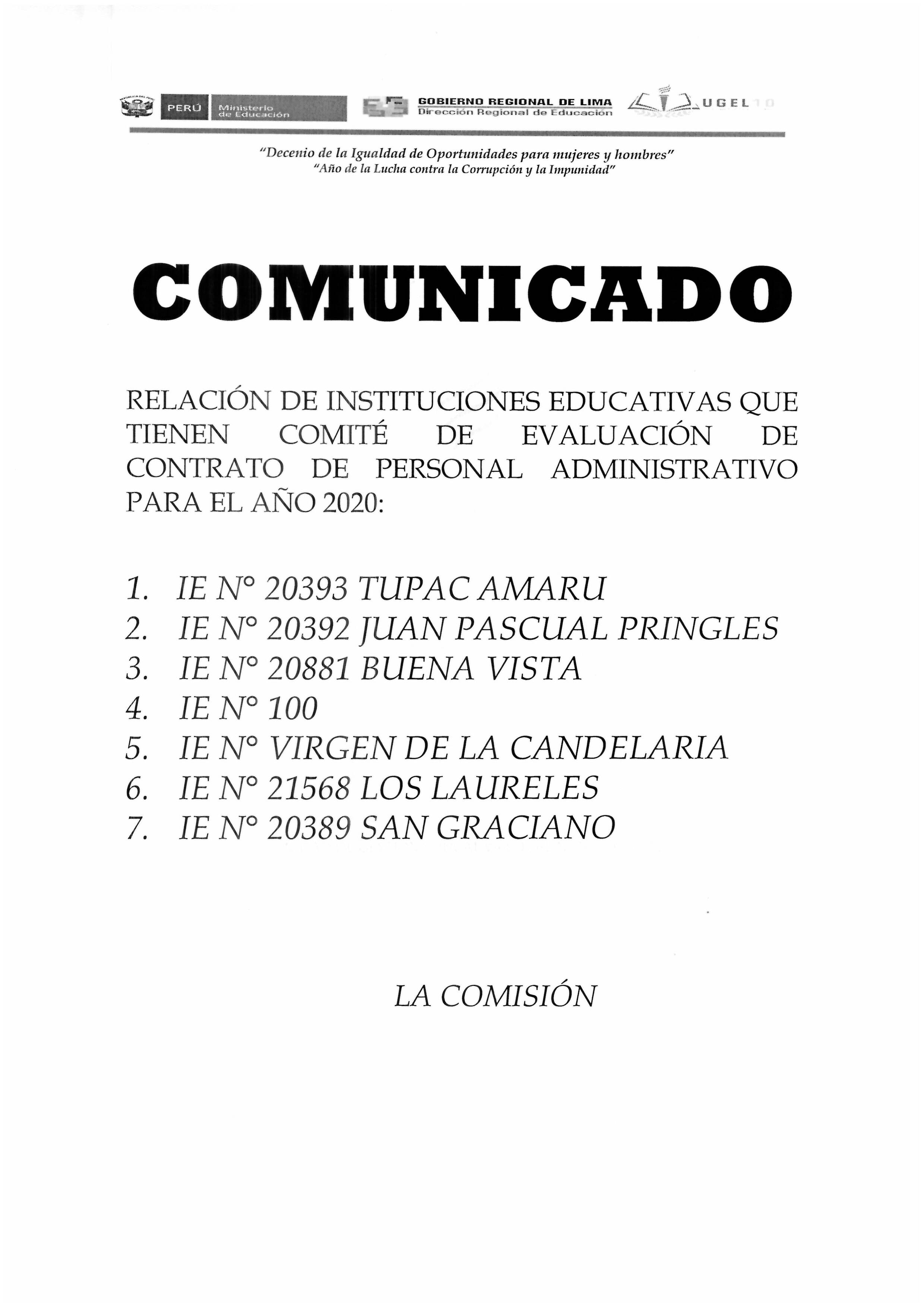 12 Dic,2019 Comunicados COMMENTS Relación de II.EE que Tienen Comité de Evaluación de Contrato de Personal Administrativo 2020.