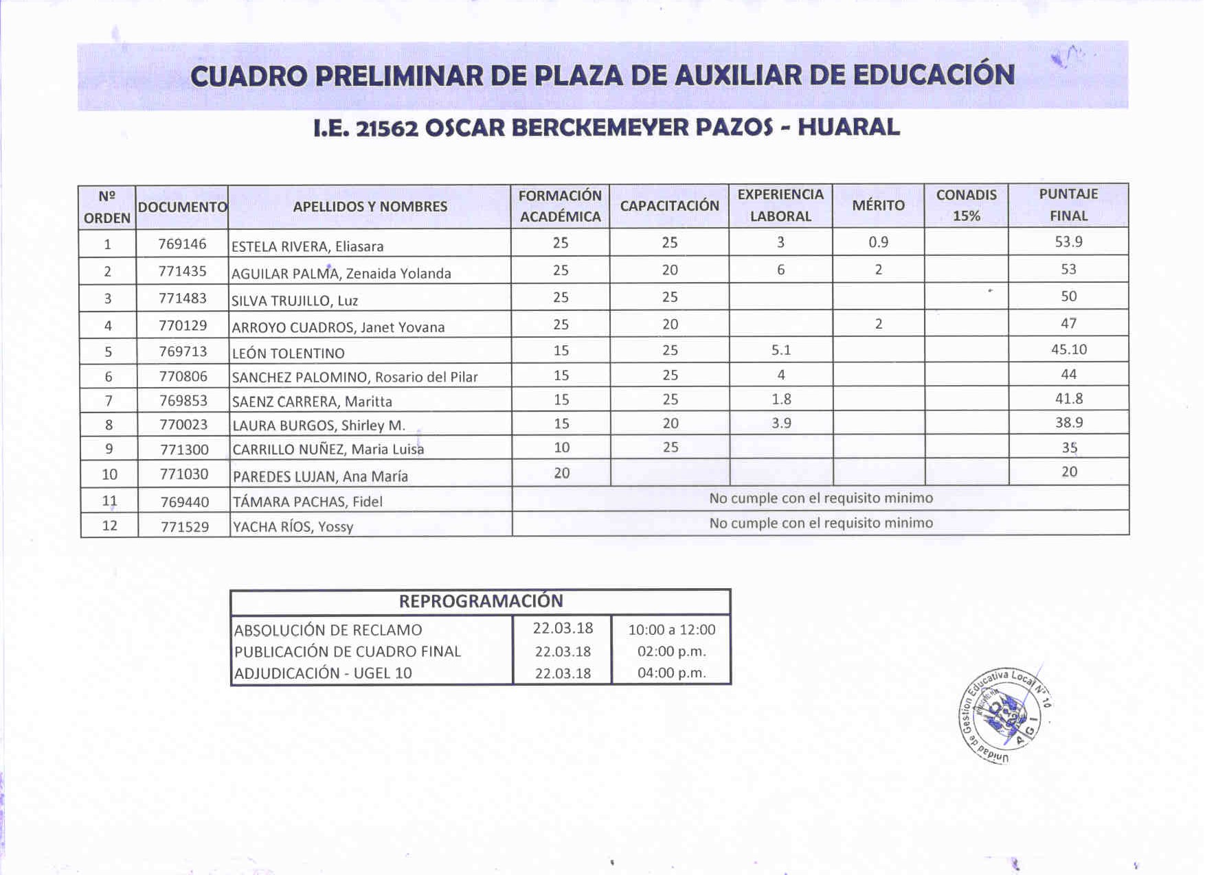 26 Mar,2018 Comunicados COMMENTS Plaza Auxiliar I.E Oscar Berckemeyer - Cuadro preliminar Este es el cuadro preliminar para la plaza de Auxiliar de Educación en la I.E N° 21562