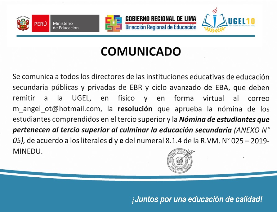 07 Ene,2020 Comunicados COMMENTS Comunicado Para los Directores de las II.EE de Educación Públicas y Privadas de EBR y Ciclo Avanzado de EBA