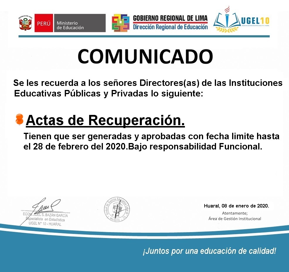 08 Ene,2020 Comunicados COMMENTS Comunicado a Directores(as) de II.EE. Públicas y Privadas - Actas de Recuperación.