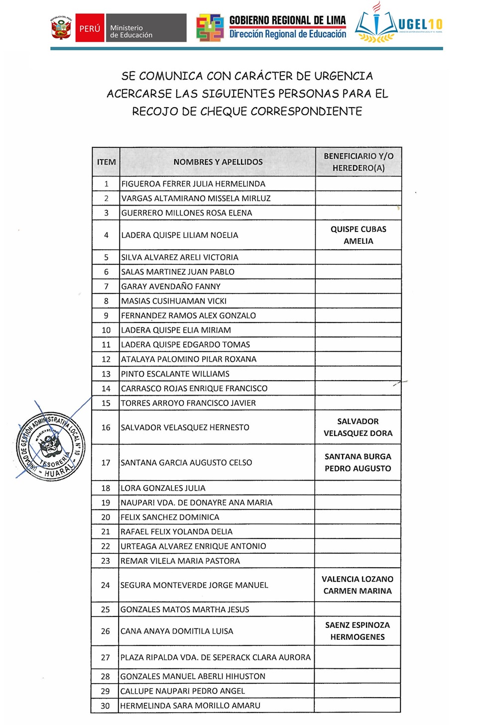 08 Ene,2020 Comunicados COMMENTS Acercarse con carácter de urgencia las siguientes personas para el recojo de cheque correspondiente.