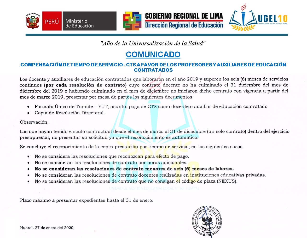 27 Ene,2020 Comunicados COMMENTS Comunicado CTS a Favor de los Profesores y Auxiliares de Educación Contratados.