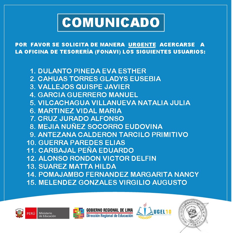 Horarios de atención UGEL N°10: Lunes a Viernes de 08:30 a.m. - 12:30 p.m. y de 14:00 p.m. - 16:30 p.m.