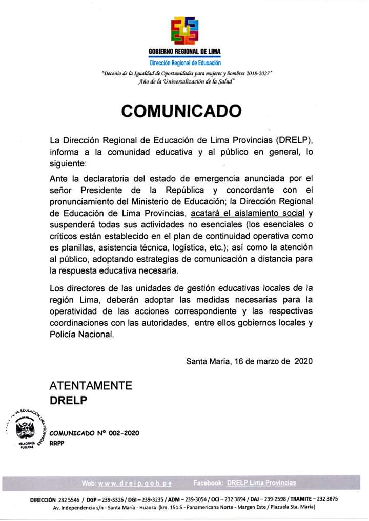 16 Mar,2020 Comunicados COMMENTS COMUNICADO DE LA DIRECCIÓN REGIONAL DE EDUCACIÓN DE LIMA PROVINCIAS (DRELP)