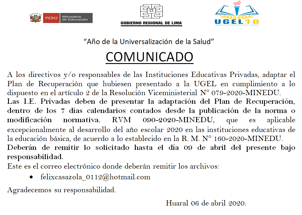 06 Abr,2020 Comunicados COMMENTS A LOS DIRECTIVOS Y/O RESPONSABLES DE LAS INSTITUCIONES EDUCATIVAS PRIVADAS , PRESENTAR LA ADAPTACIÓN DEL PLAN DE RECUPERACIÓN.