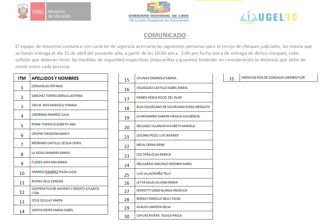 13 Abr,2020 Comunicados COMMENTS El equipo de tesorería comunica con carácter de urgencia acercarse las siguientes personas para el recojo de cheques judiciales.