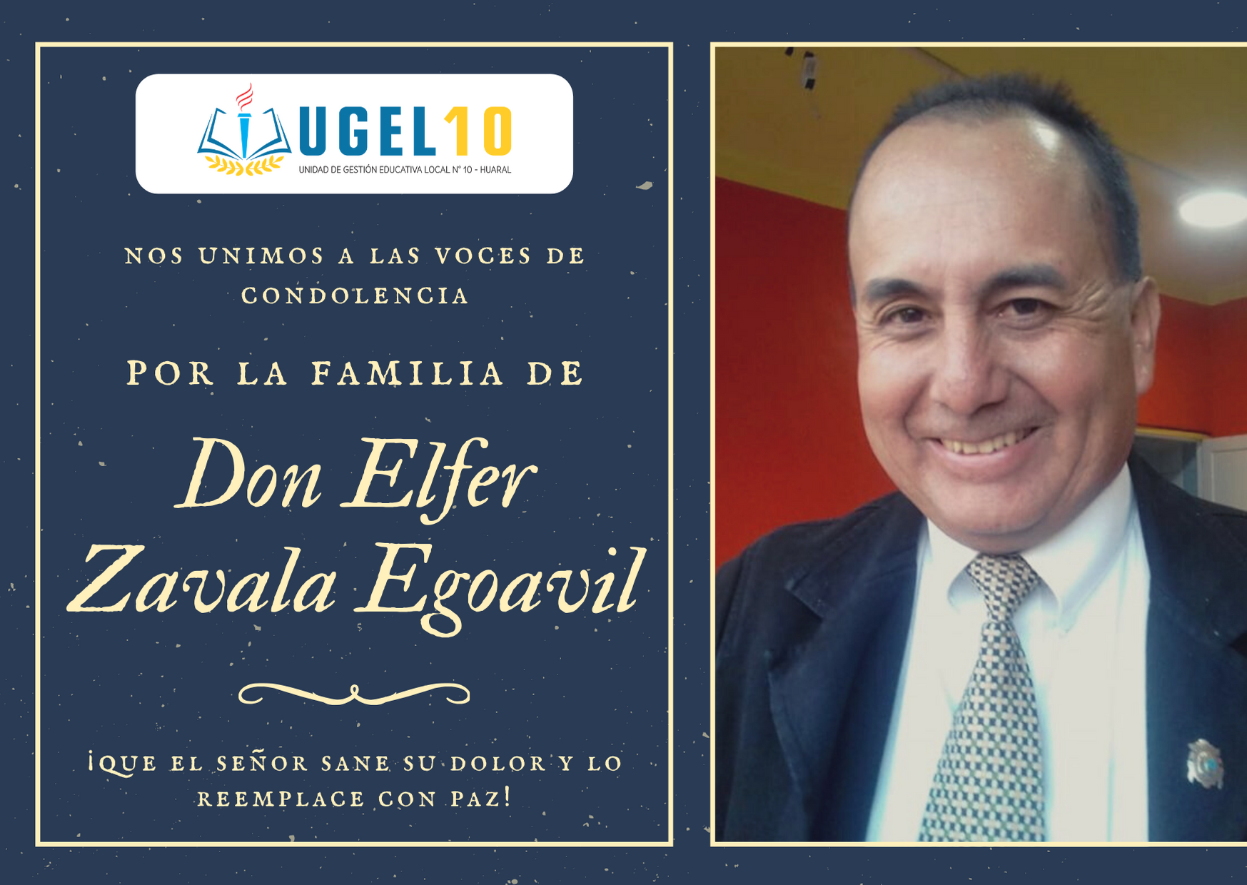 La directora de la UGEL 10 de Huaral se une a las palabras de condolencia de los Directivos, funcionarios administrativos, docentes, estudiantes y padres de familia de la I.E. Emblemática Andres de los Reyes, por el sensible fallecimiento de Don Elfer Zavala Egoavil, quien se desempeño hasta el año 2015 como docente en el área de ARTE.