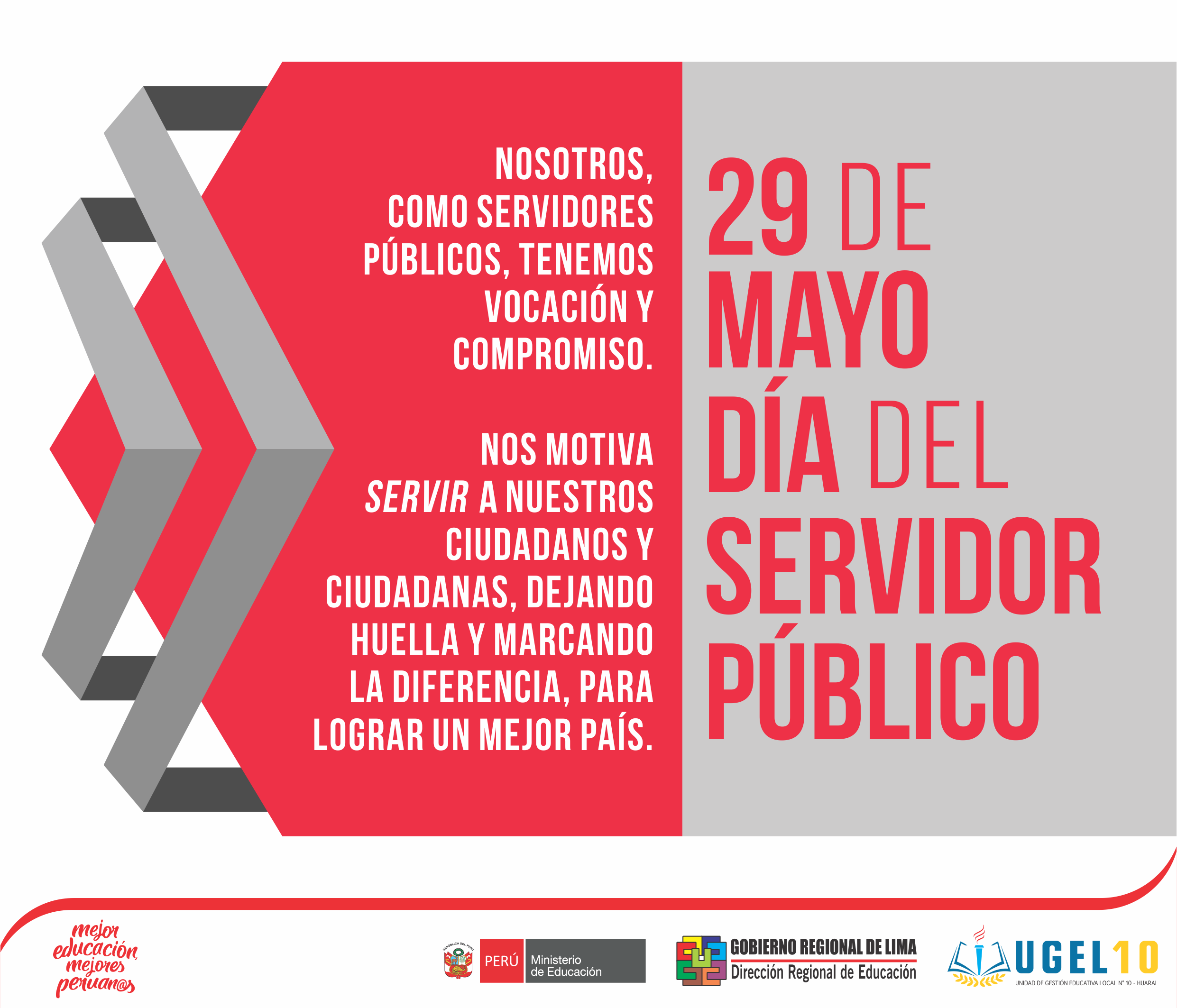 La directora de la UGEL 10 - Huaral, expresa su más cordial saludo a todos los trabajadores que laboran para el Estado, al celebrarse el 29 de mayo, el Día del Servidor Público.