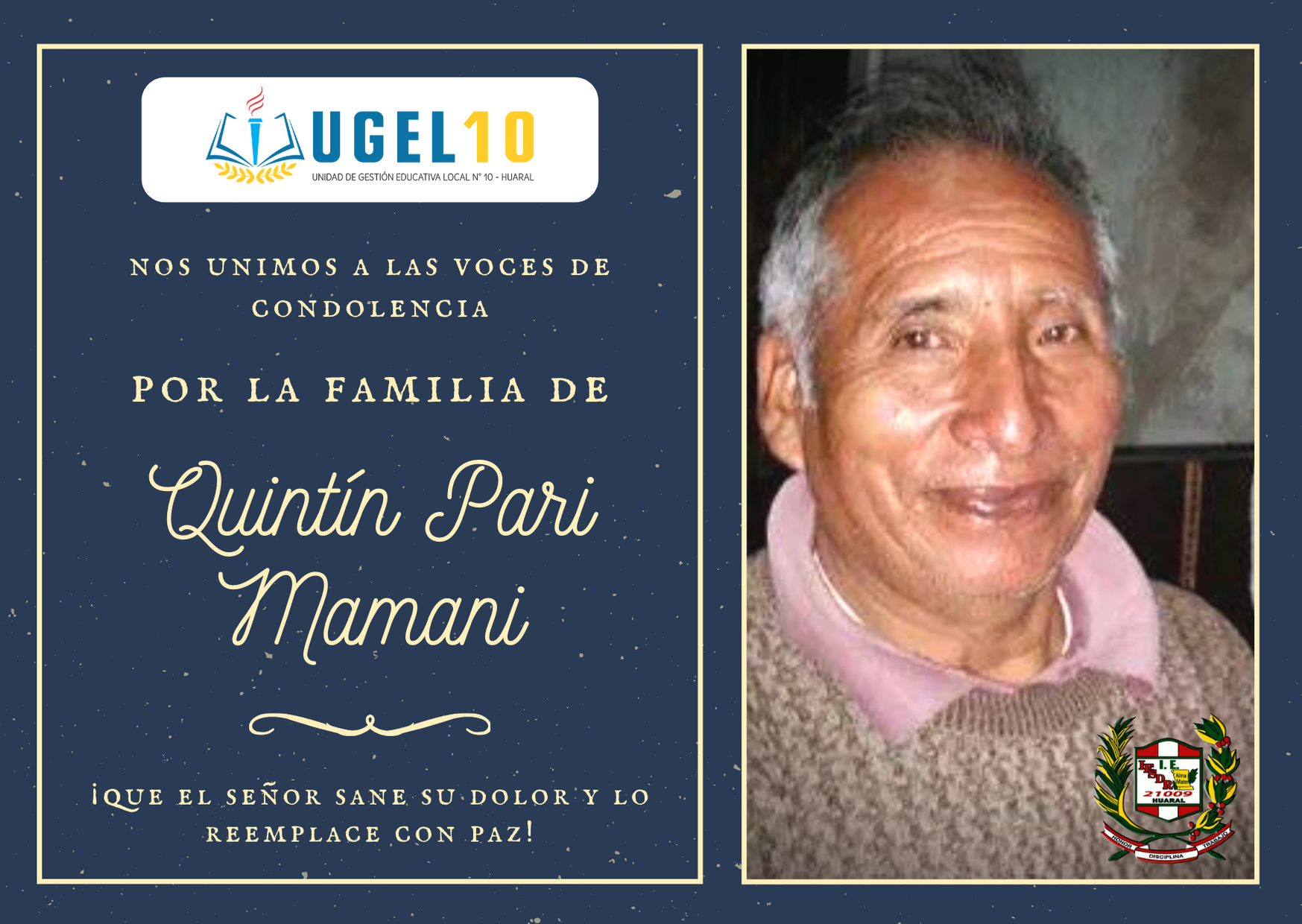 La directora de la UGEL 10 de Huaral se une a las palabras de condolencia de los Directivos, funcionarios administrativos, docentes, estudiantes y padres de familia de la I.E. 21009 Luis Felipe Subauste del Río, por el sensible fallecimiento de Quintín Pari Mamani, quien ha sido por muchos años parte del personal administrativo de dicha institución.