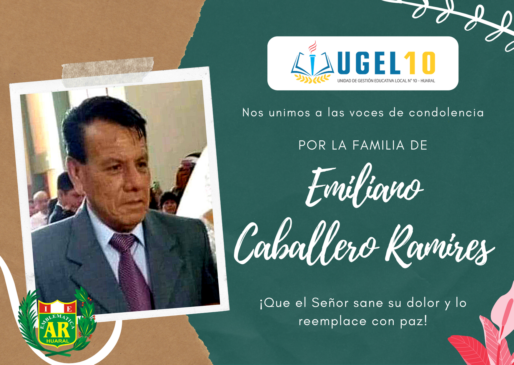 La directora de la UGEL 10 de Huaral se une a las palabras de condolencia de los Directivos, funcionarios administrativos, docentes, estudiantes y padres de familia de la I.E. Andrés de los Reyes, por el sensible fallecimiento de Emiliano Caballero Ramires, quien ha sido por muchos años un gran maestro dictando el curso de Historia del Perú en dicha institución.