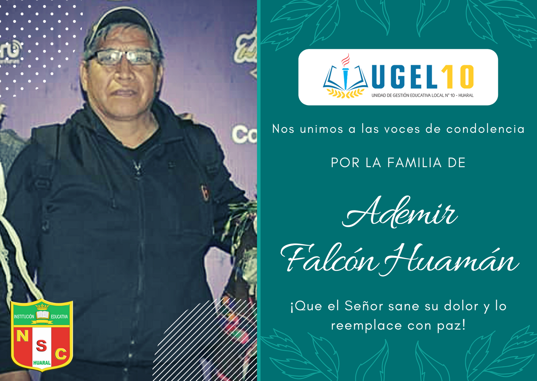 La directora de la UGEL 10 de Huaral se une a las palabras de condolencia de los Directivos, funcionarios administrativos, docentes, estudiantes y padres de familia de la I.E. Nuestra Señora del Carmen, por el sensible fallecimiento de Ademir Falcón Huamán, quien ha sido por muchos años un gran maestro en dicha institución y uno de los impulsores de la danza ancestral del Quiullo, danza típica de la comunidad de Chauca.