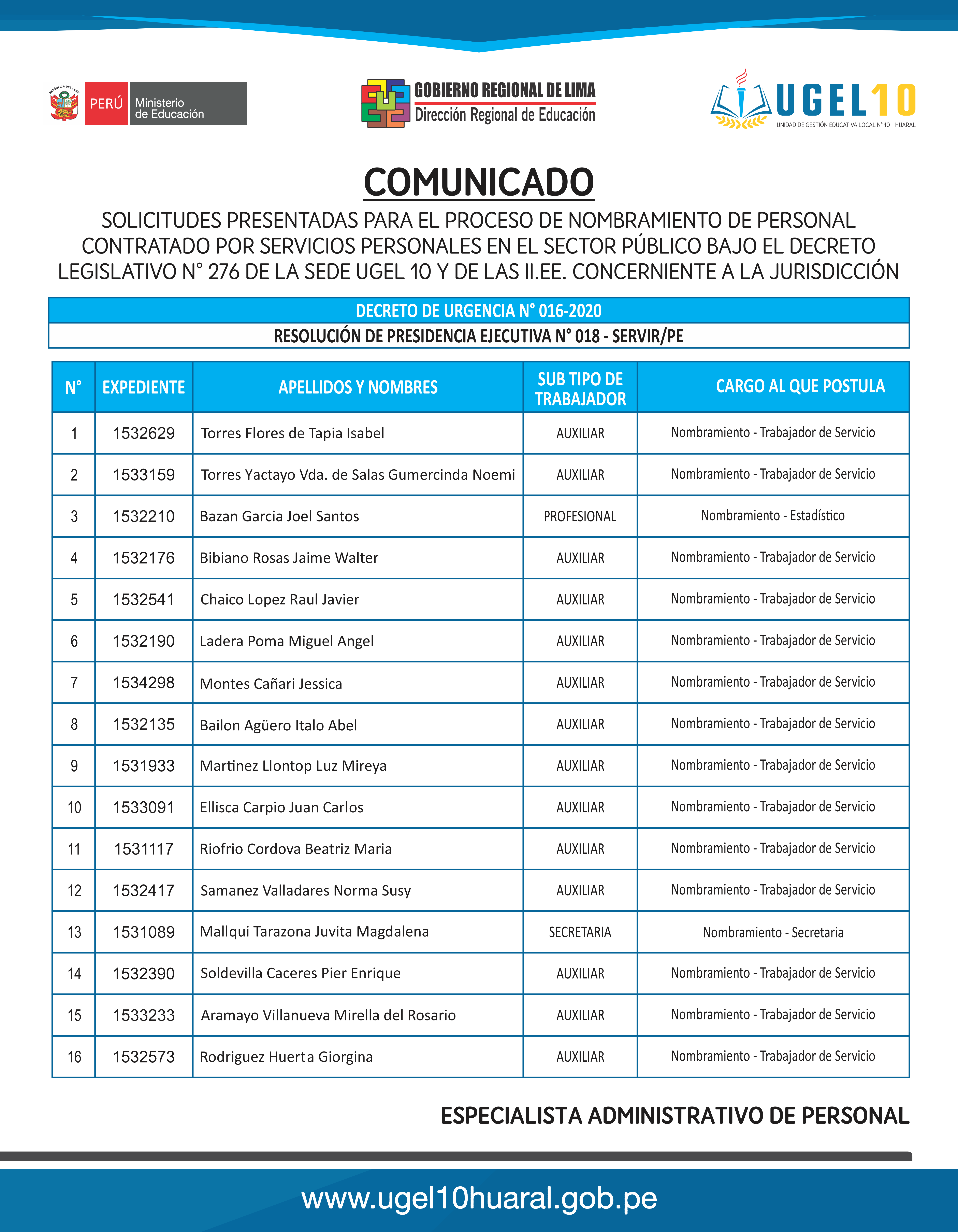 23 Jun,2020 Comunicados COMMENTS SOLICITUDES PRESENTADAS PARA EL PROCESO DE NOMBRAMIENTO DE PERSONAL CONTRATADO POR SERVICIOS PERSONALES EN EL SECTOR PÚBLICO BAJO EL DECRETO LEGISLATIVO N° 276 DE LA SEDE UGEL 10 Y DE LAS II.EE. CONCERNIENTE A LA JURISDICCIÓN