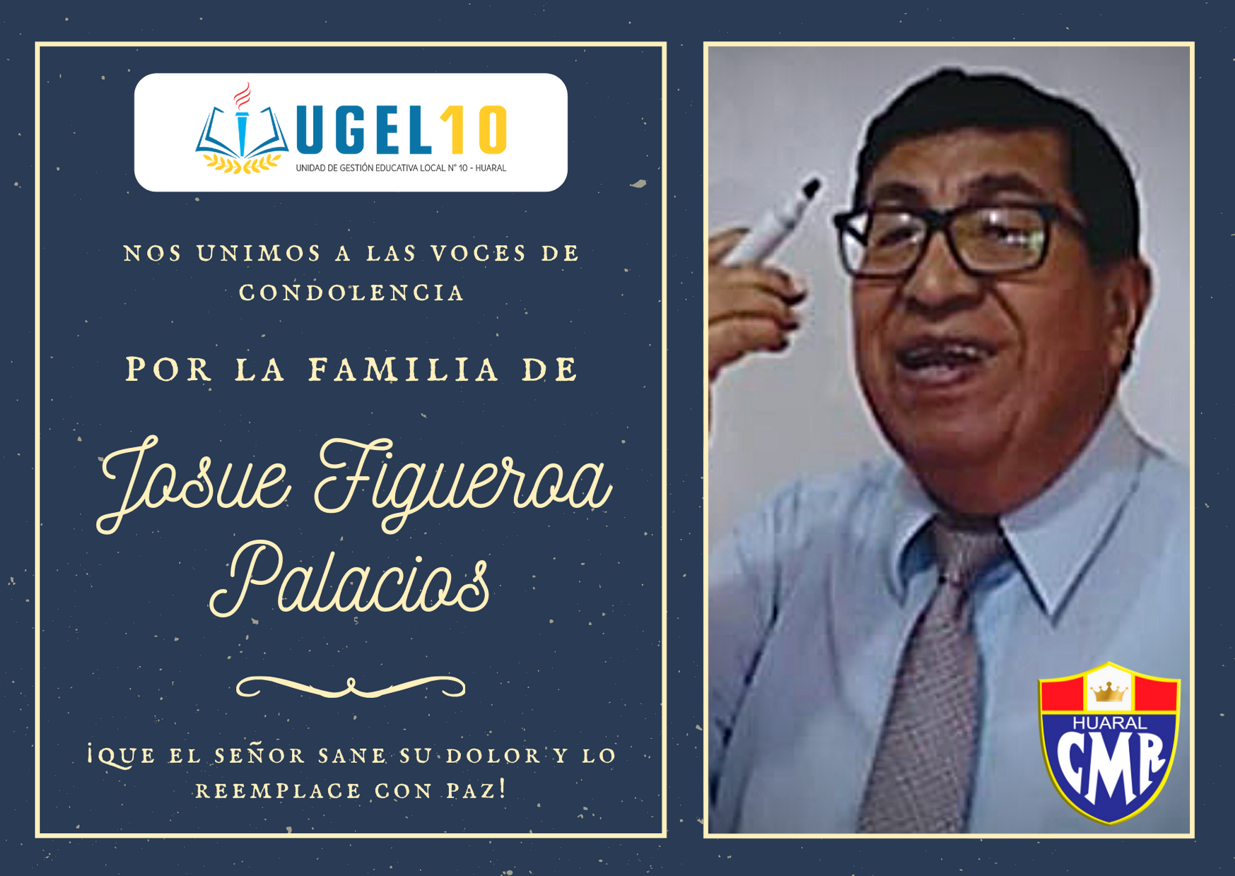La directora de la UGEL 10 de Huaral se une a las palabras de condolencia de los Directivos, funcionarios administrativos, docentes, estudiantes y padres de familia del Colegio Parroquial María Reyna, por el sensible fallecimiento de Josue Figueroa Palacios, quien ha sido por muchos años un gran maestro en dicha institución en el curso de Razonamiento Verbal.