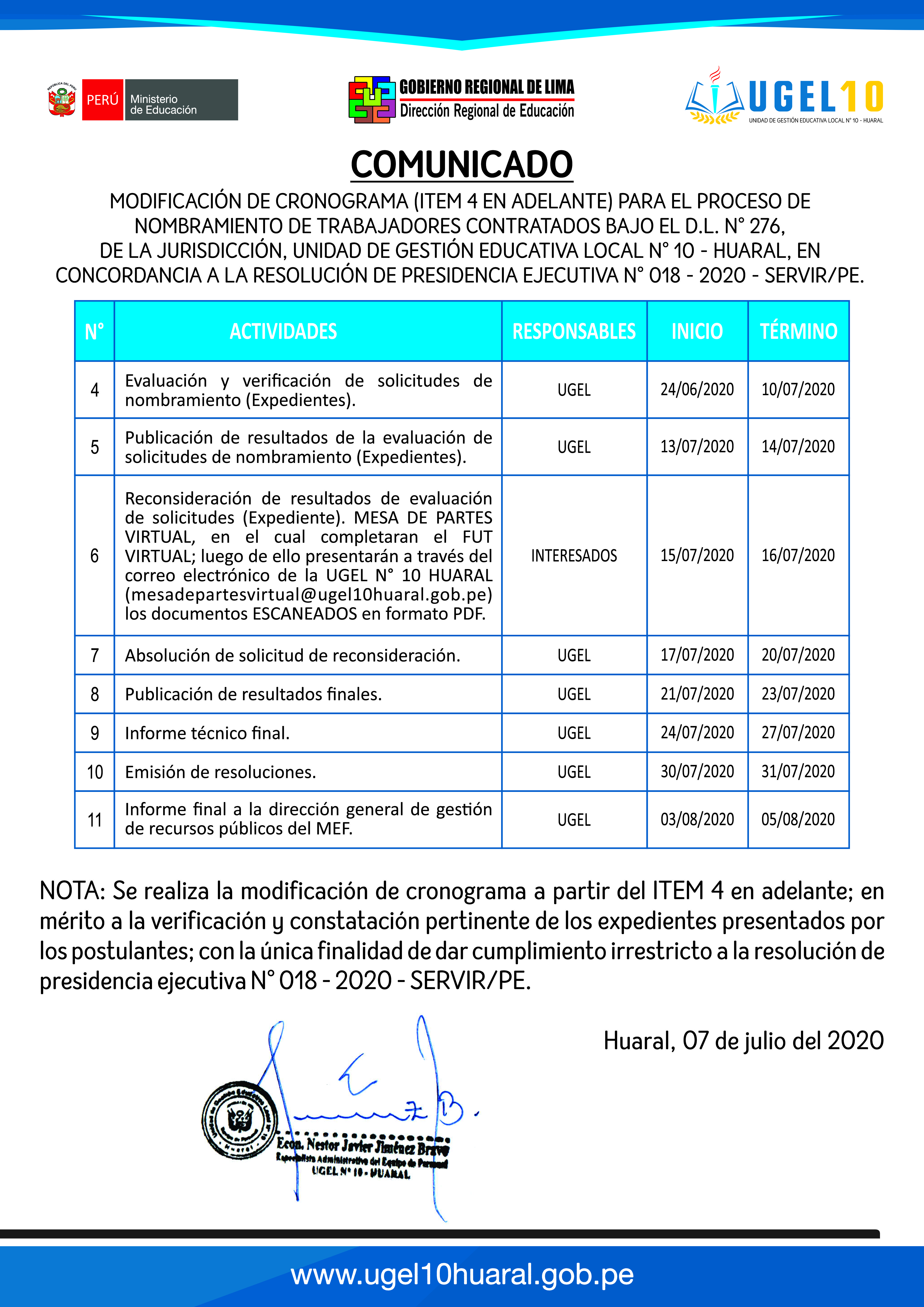 MODIFICACIÓN DE CRONOGRAMA (ITEM 4 EN ADELANTE) PARA EL PROCESO DE NOMBRAMIENTO DE TRABAJADORES CONTRATADOS BAJO EL D.L. N° 276, DE LA JURISDICCIÓN, UNIDAD DE GESTIÓN EDUCATIVA LOCAL N° 10 - HUARAL, EN CONCORDANCIA A LA RESOLUCIÓN DE PRESIDENCIA EJECUTIVA