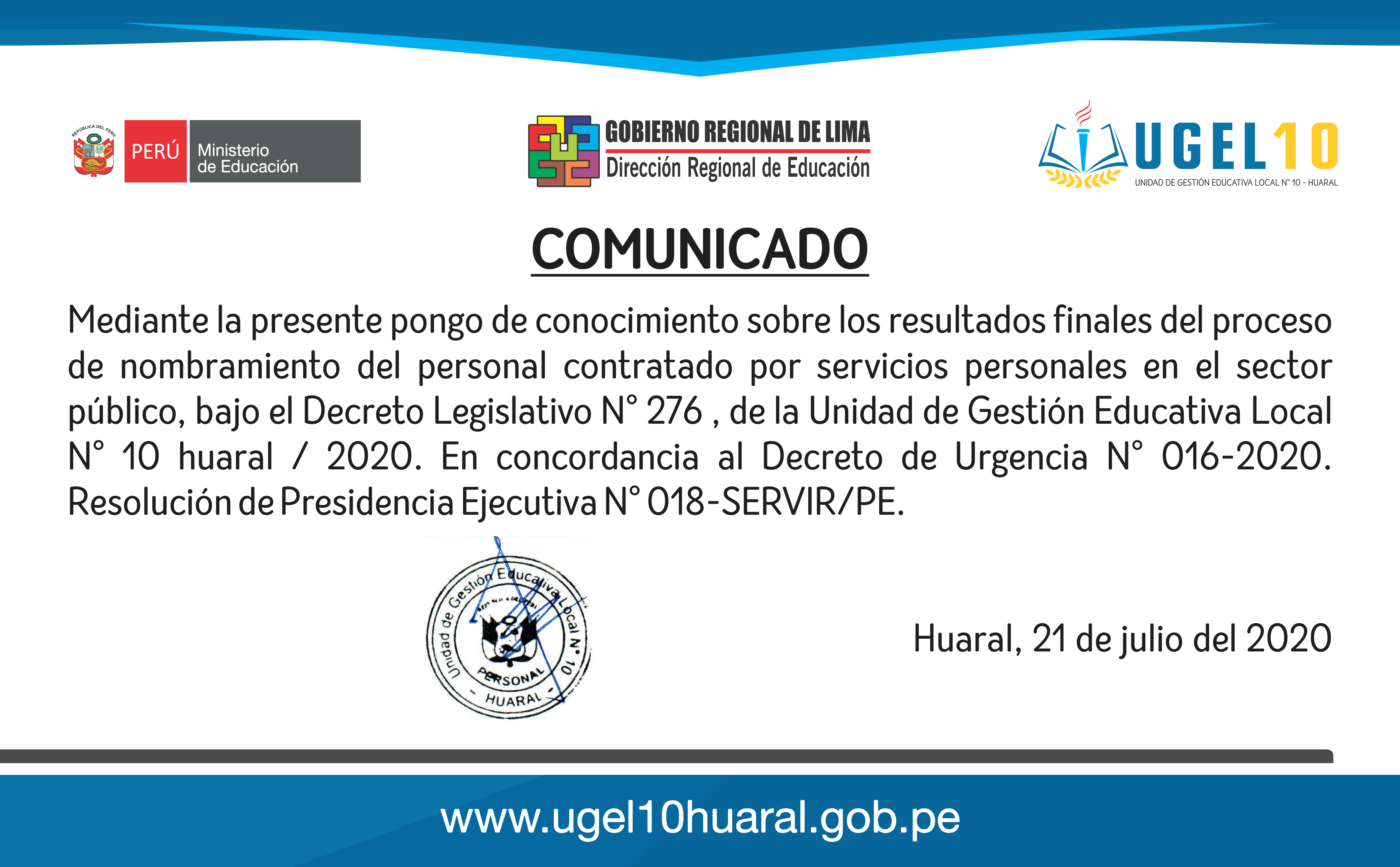 21 Jul,2020 Comunicados COMMENTS RESULTADOS FINALES DEL PROCESO DE NOMBRAMIENTO DEL PERSONAL CONTRATADO POR SERVICIOS PERSONALES EN EL SECTOR PÚBLICO, BAJO EL DECRETO LEGISLATIVO N° 276 , DE LA UGEL N°10 HUARAL/2020. - D.U. N° 016-2020. R.P.E. N° 018-SERVIR/PE. ✅ VER RESULTADOS FINALES ➡️ https://drive.google.com/file/d/1iVJ9strNxC1SN4-waQB_XTIVynJNRaxO/view?usp=sharing