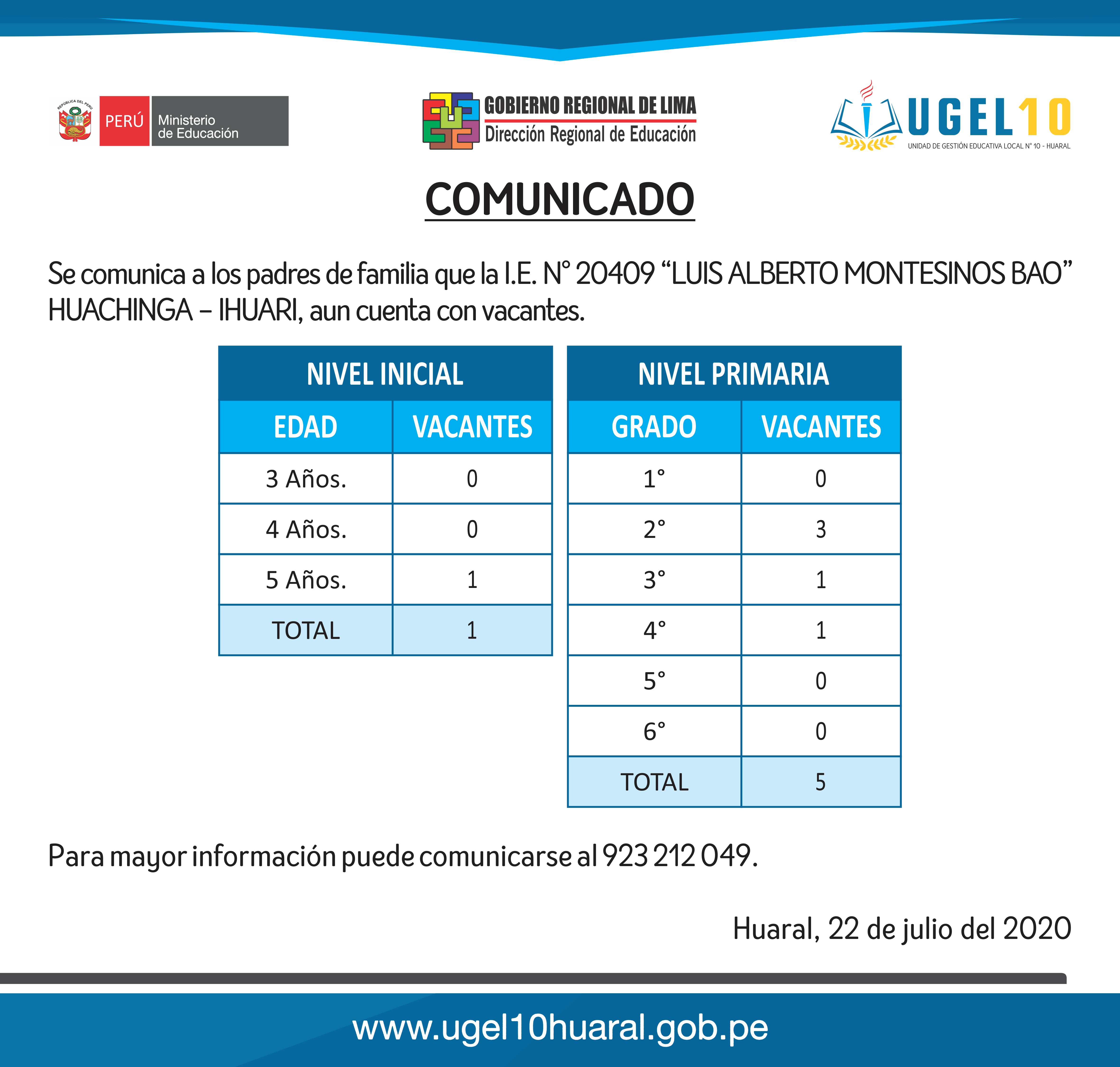 22 Jul,2020 Comunicados COMMENTS VACANTES I.E. N° 20409 “LUIS ALBERTO MONTESINOS BAO” HUACHINGA – IHUARI.