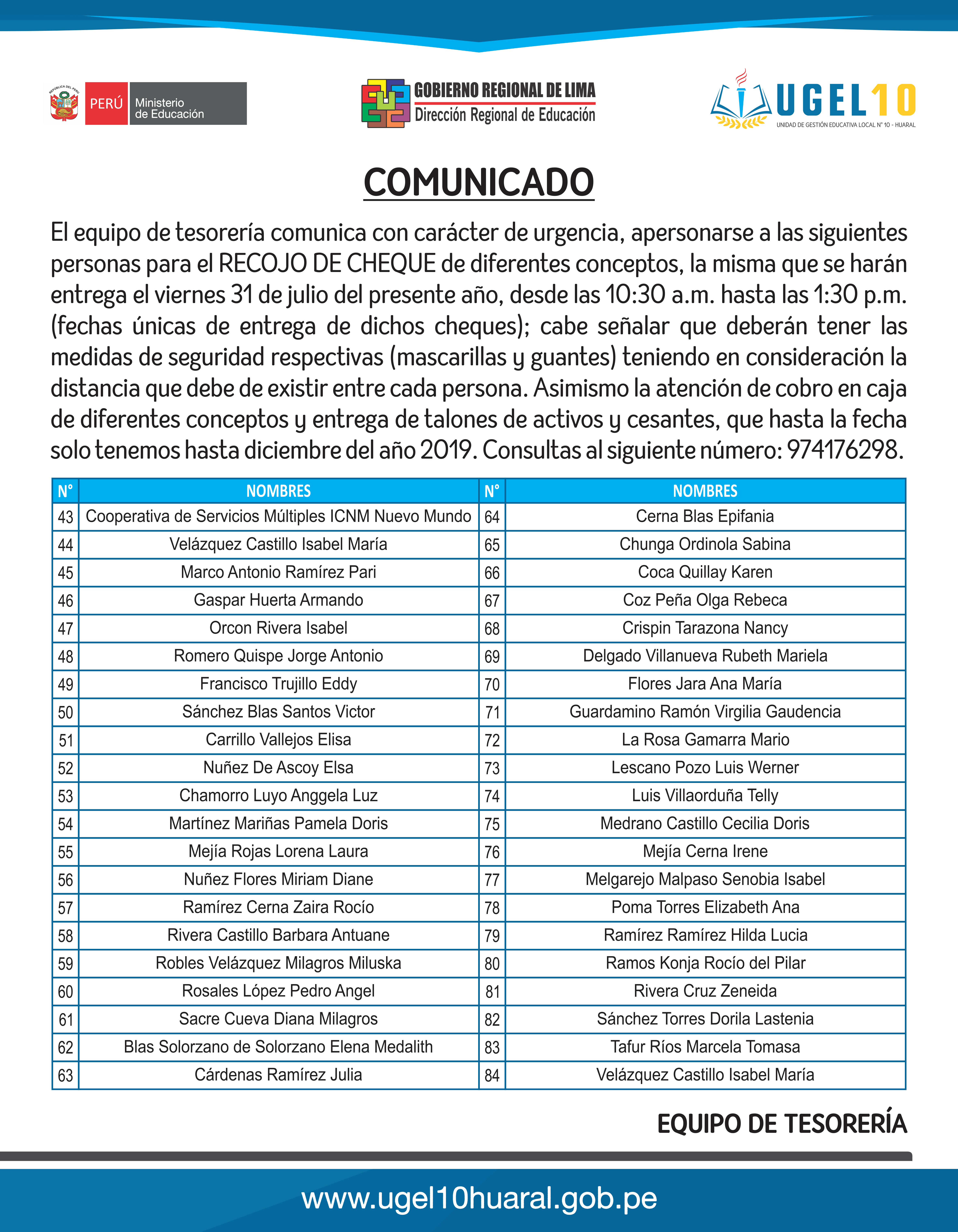 30 Jul,2020 Comunicados COMMENTS COMUNICADO: RECOJO DE CHEQUE PARA EL DÍA VIERNES 31 DE JULIO (Parte 2)