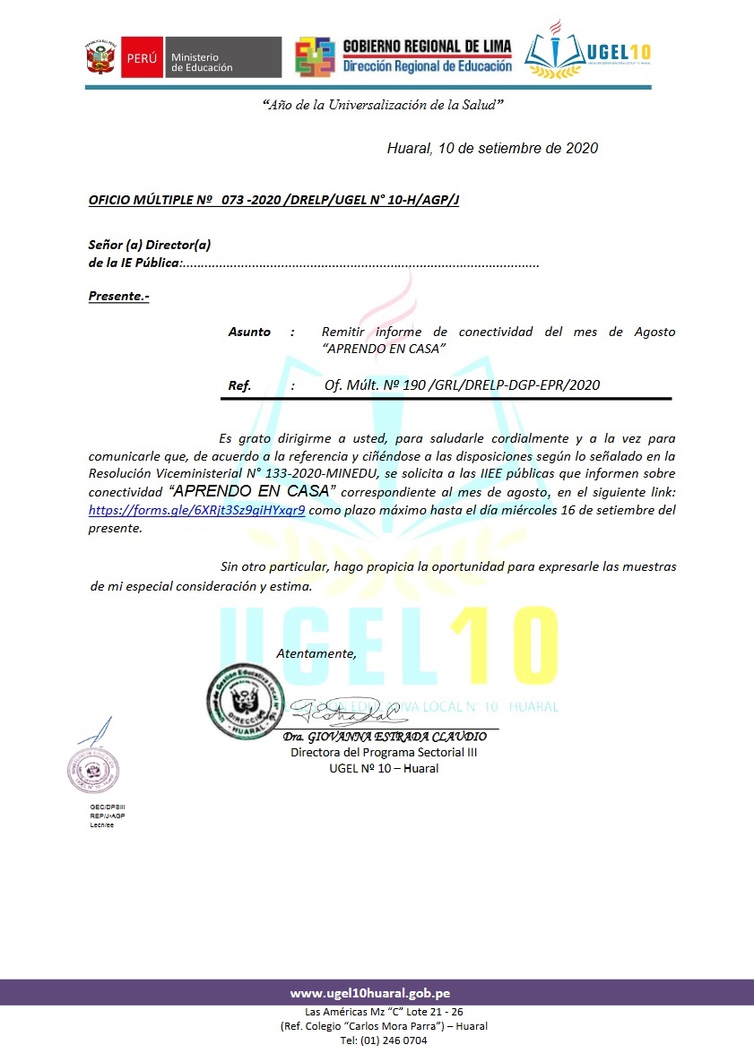 11 Sep,2020 Comunicados COMMENTS Remitir Informe de Conectividad del Mes de Agosto "Aprendo en Casa". Después de leer el Oficio ingresar al siguiente enlace: https://forms.gle/6XRjt3Sz9giHYxqr9 VER ANEXOS AQUÍ