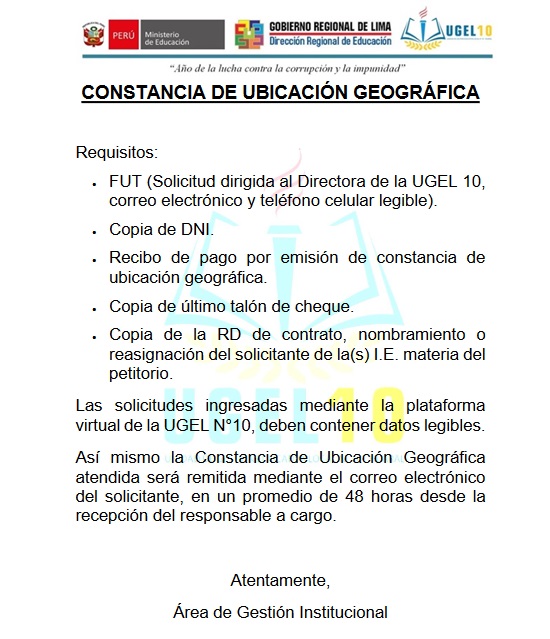 Horarios de atención UGEL N°10: Lunes a Viernes de 08:30 a.m. - 12:30 p.m. y de 14:00 p.m. - 16:30 p.m.