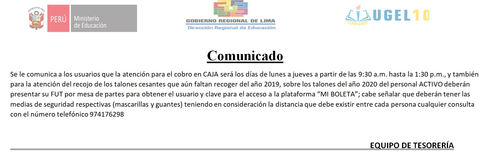 Horarios de atención UGEL N°10: Lunes a Viernes de 08:30 a.m. - 12:30 p.m. y de 14:00 p.m. - 16:30 p.m.