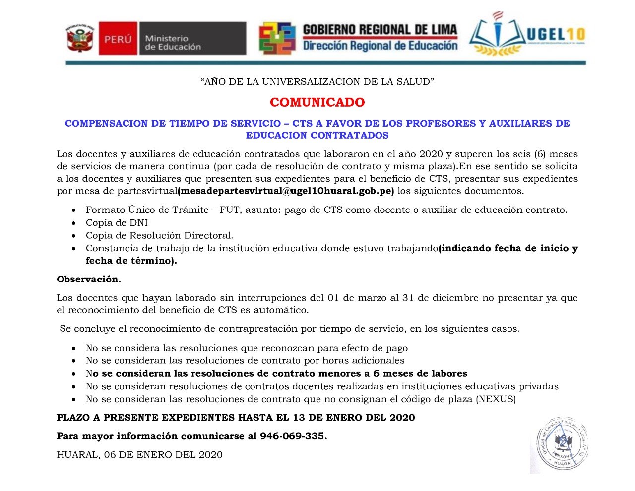 11 Ene,2021 Comunicados COMMENTS COMUNICADO: COMPENSACIÓN DE TIEMPO DE SERVICIO-CTS A FAVOR DE LOS PROFESORES Y AUXILIARES DE EDUCACIÓN CONTRATADOS