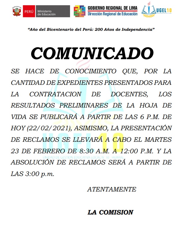 Horarios de atención UGEL N°10: Lunes a Viernes de 08:30 a.m. - 12:30 p.m. y de 14:00 p.m. - 16:30 p.m.