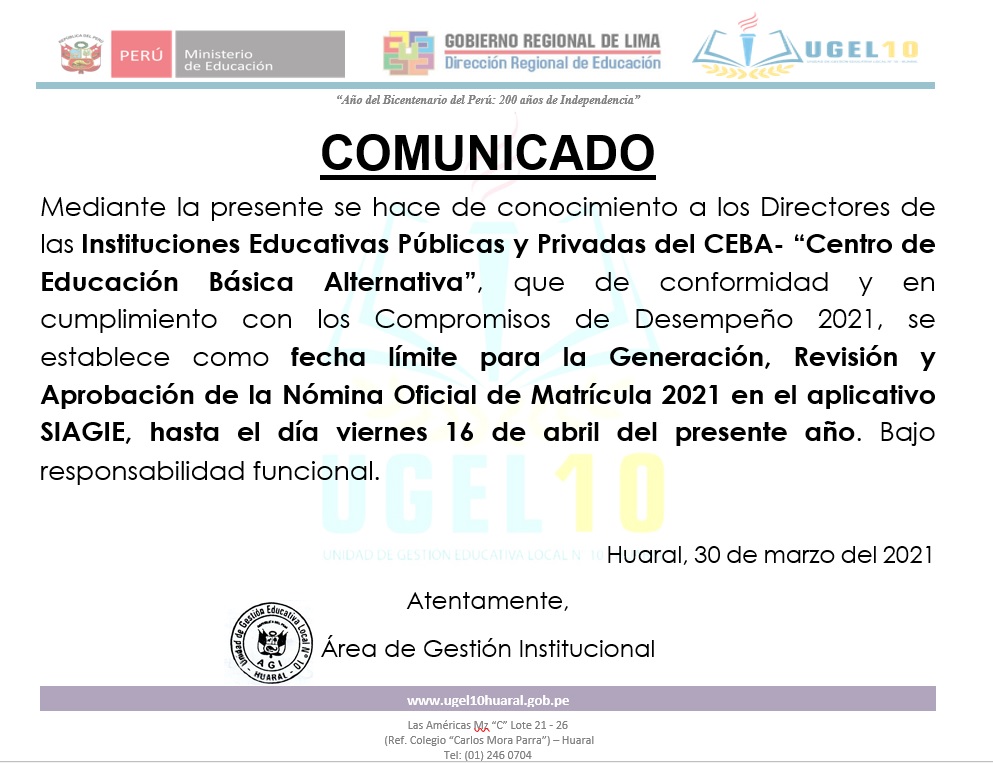 Horarios de atención UGEL N°10: Lunes a Viernes de 08:30 a.m. - 12:30 p.m. y de 14:00 p.m. - 16:30 p.m.
