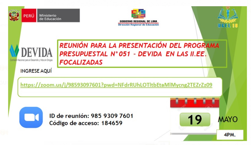 Tema: INVITACIÓN A LA REUNIÓN A DIRECTIVOS Y COORDINADOR DE TOE ,PARA LA PRESENTACIÓN DEL PROGRAMA DEVIDA Y ACCIONES PARA SU IMPLEMENTACIÓN EN LAS II.EE FOCALIZADAS EN EL AMBITO DE LA UGEL