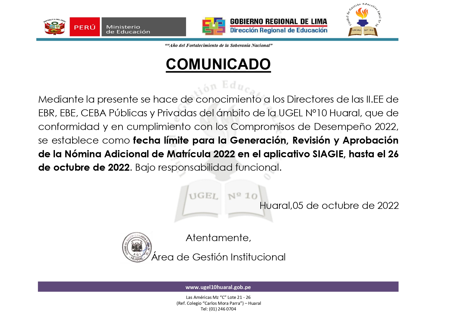 05 Oct,2022 Comunicados COMMENTS FECHA LÍMITE PARA LA GENERACIÓN, REVISIÓN Y APROBACIÓN DE LA NÓMINA ADICIONAL DE MATRÍCULA 2022 EN EL APLICATIVO SIAGIE, HASTA EL 26 DE OCTUBRE DE 2022 ✅VER COMUNICADO➡️ https://drive.google.com/file/d/1eAlK63KPkJRPbDrxa6rtnjB_dUUmLhq_/view?usp=sharing