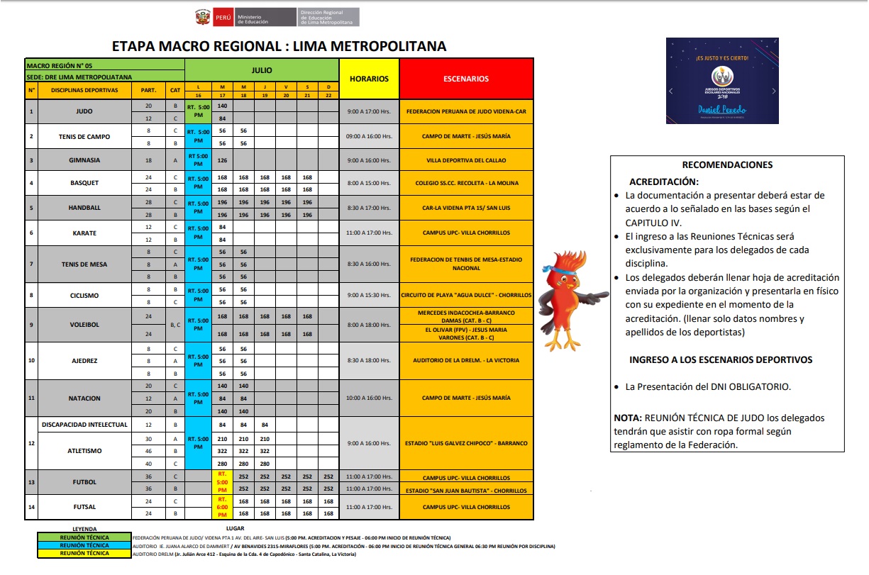 11 Jul,2018 Comunicados COMMENTS Cronograma Oficial y Sedes de la Etapa Macro Regional de los Juegos Deportivos Escolares Nacionales 2018. ver sedes Macro Lima ver y descargar ficha de acreditación obligatoria