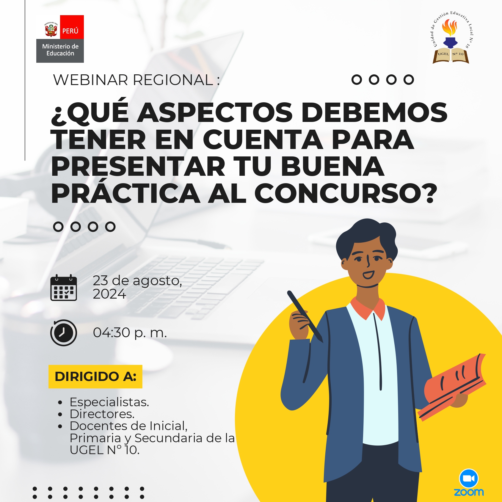 22 Ago,2024 Comunicados COMMENTS CONVOCATORIA A PARTICIPAR DEL WEBINAR REGIONAL ¿QUÉ ASPECTOS DEBEMOS TENER EN CUENTA PARA PRESENTAR TU BUENA PRÁCTICA AL CONCURSO? ✅️VER COMUNICADO ➡️ https://drive.google.com/file/d/1ch4ThDLnD0AUqqMACWOWWo19eiSnaO9E/view?usp=sharing