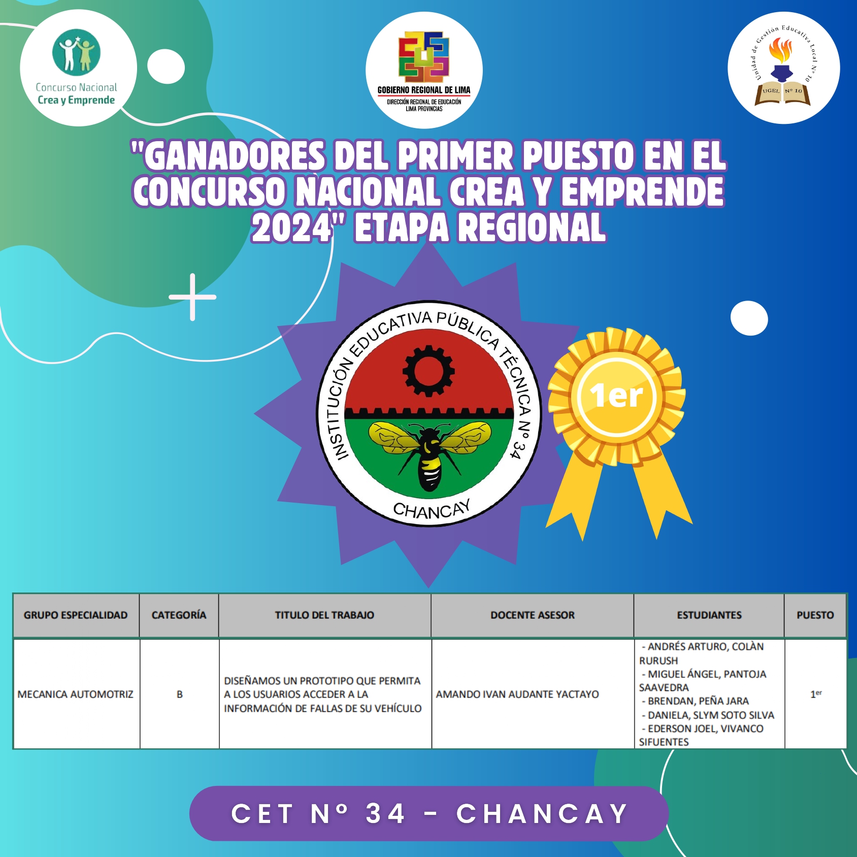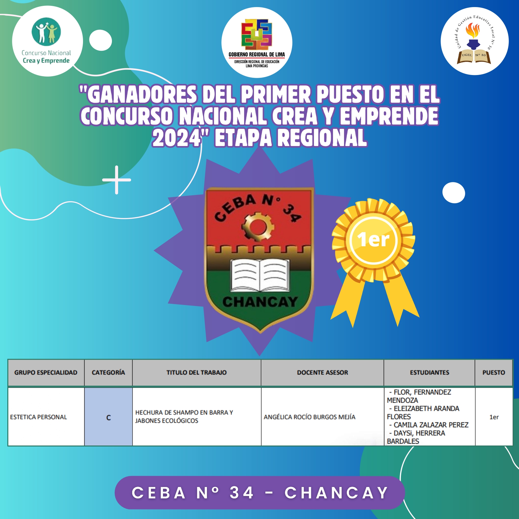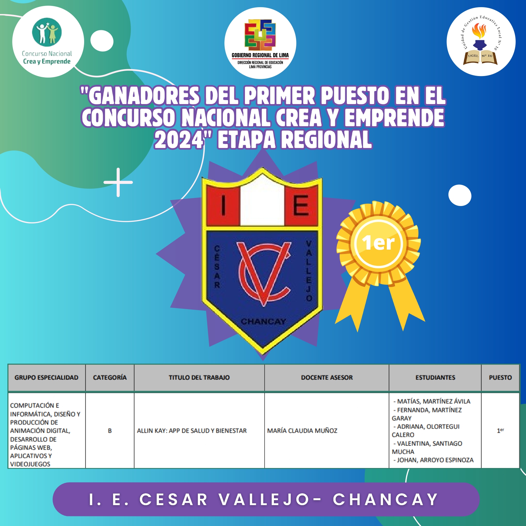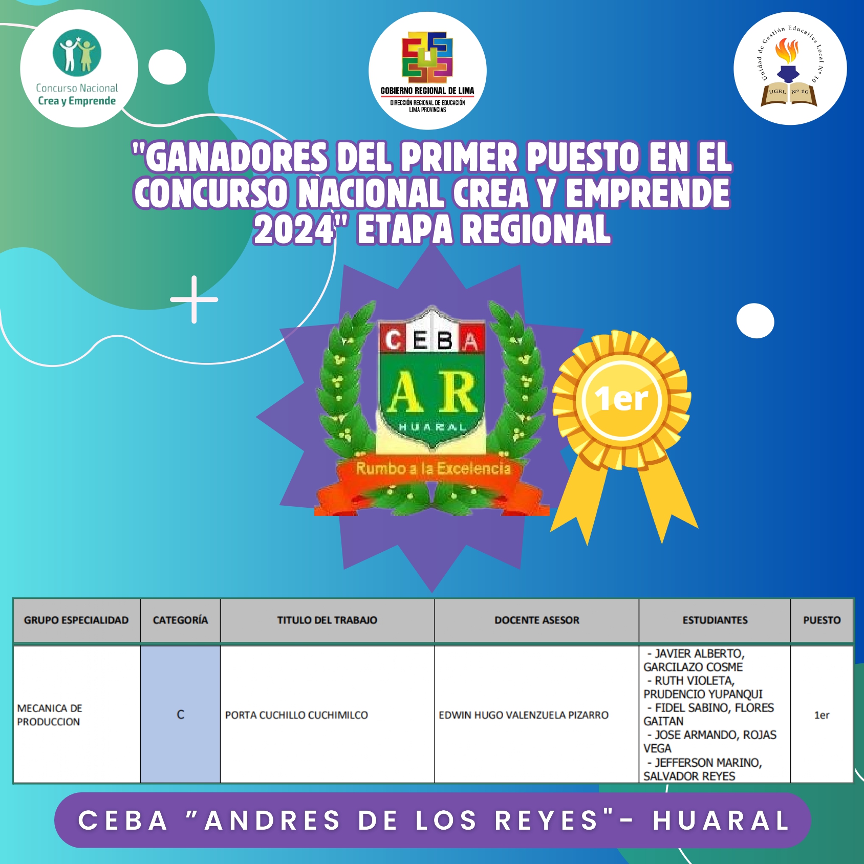 La UGEL Nº 10 extiende sus más sinceras felicitaciones a los estudiantes, docentes asesores e Instituciones Educativas que han logrado el primer puesto en el Concurso Nacional “Crea y Emprende 2024” en la Etapa Regional (DRELP).