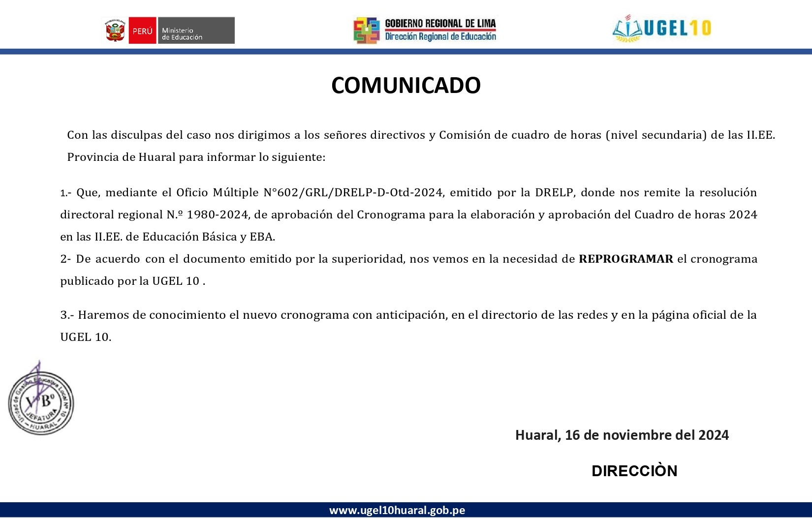 17 Nov,2024 Comunicados COMMENTS COMUNICADO: (Directivos y comisión de cuadro de horas del nivel secundaria) ✅️ VER COMUNICADO ➡️ https://drive.google.com/file/d/1o_D0BxjhX_6UWuaHDU-4XfumtTg4YQx-/view?usp=sharing