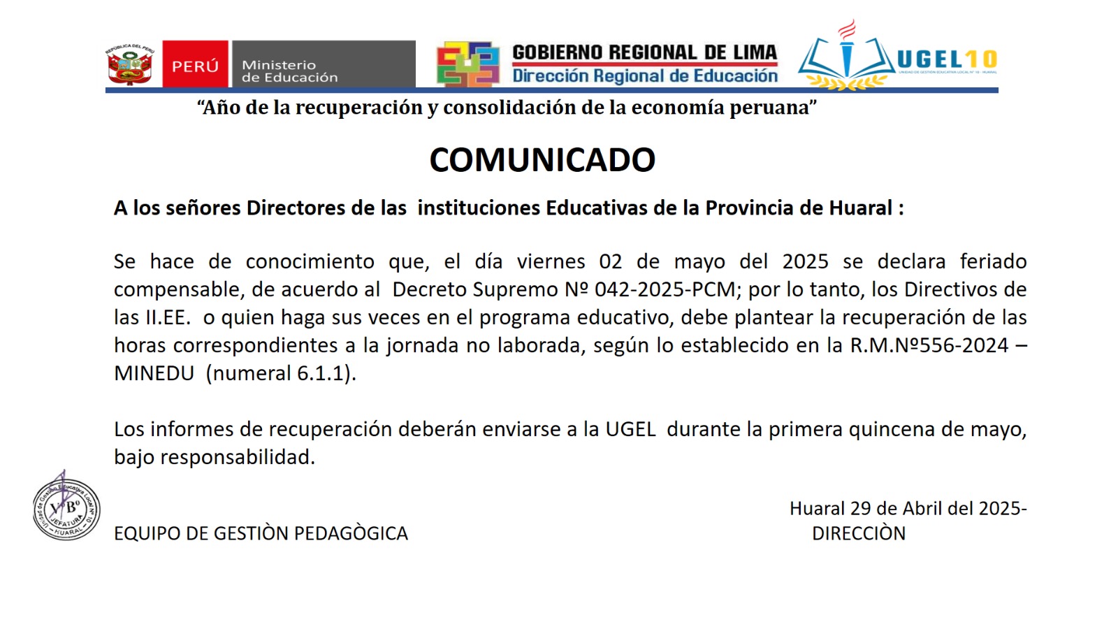 30 Abr,2025 Comunicados COMMENTS Comunicado a los Directores de las II. EE. de la provincia de Huaral (viernes 02 de mayo)