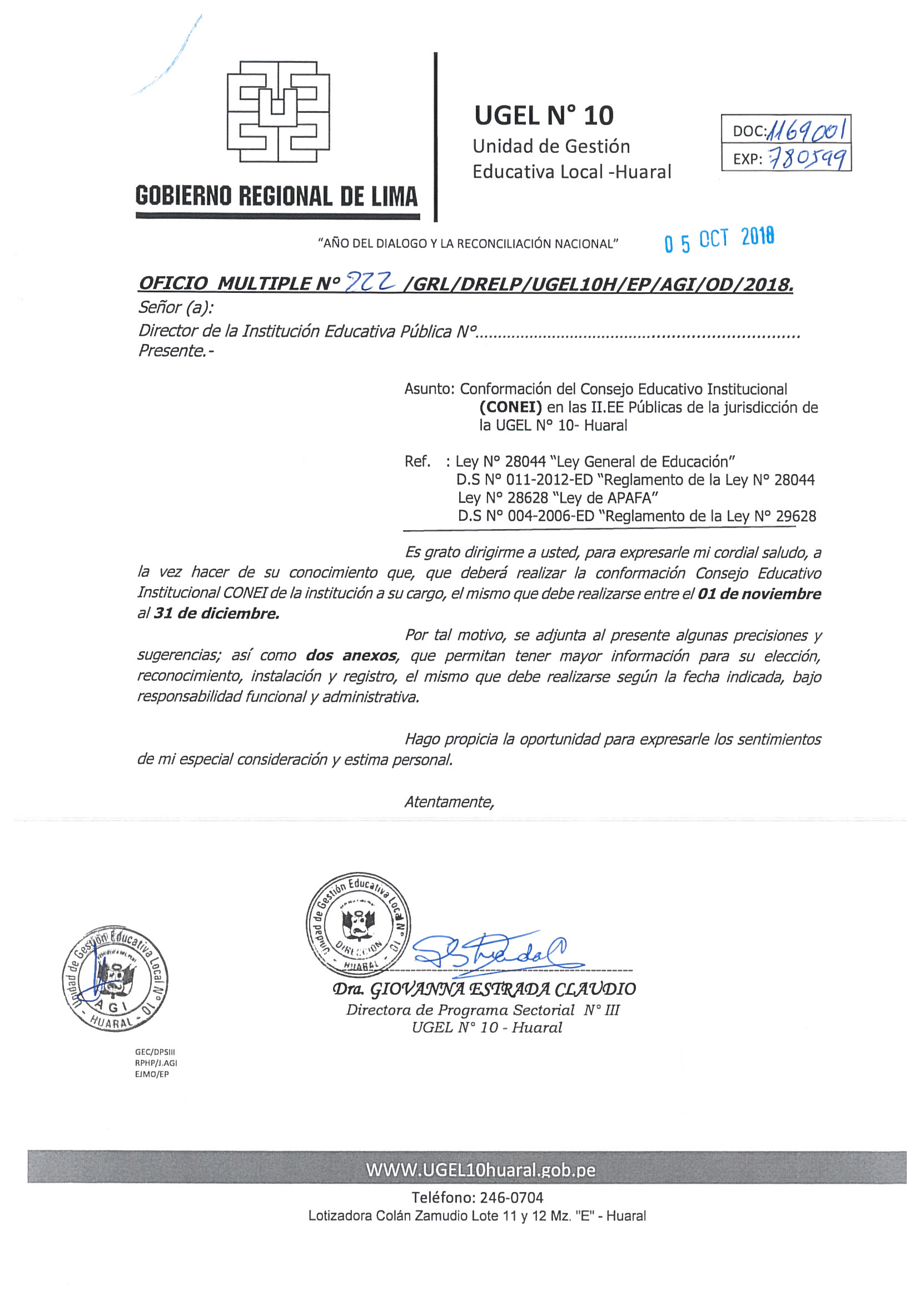 09 Oct,2018 Comunicados COMMENTS CONFORMACIÓN DEL CONSEJO EDUCATIVO INSTITUCIONAL (CONEI) EN LAS II.EE PÚBLICAS DE LA JURISDICCIÓN DE LA UGEL N°10 VER ANEXOS